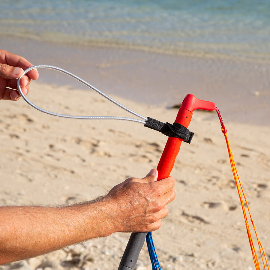 Attachment System: Self-tightening "loop-on" design, secured with Velcro. Fit to a wing handle/boom or parawing control bar in seconds. No components to attach/remove